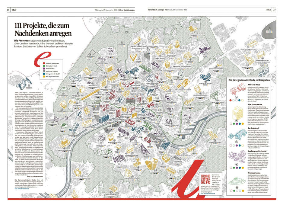 Die Projekte wurden von der Gast-Redaktion der Kunst-Sonderausgabe LIEBE DEINE STADT – ARCHITEKTUR & DEMOKRATIE des Kölner Stadt-Anzeiger – bestehend aus dem Konzeptkünstler Merlin Bauer, Prof. Anne-Julchen Bernhardt, Dr. Adria Daraban und dem Stadtforscher Boris Sieverts – kartiert.