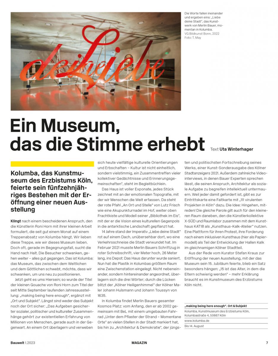 MUSEUM KOLUMBA: Die gesamte Kunst-Sonderausgabe „LIEBE DEINE STADT – ARCHITEKTUR & DEMOKRATIE“ zur sozialen und ökologischen Transformation unserer Städte mit Gastbeiträgen internationaler Autor*innen hier zum Durchstöbern …